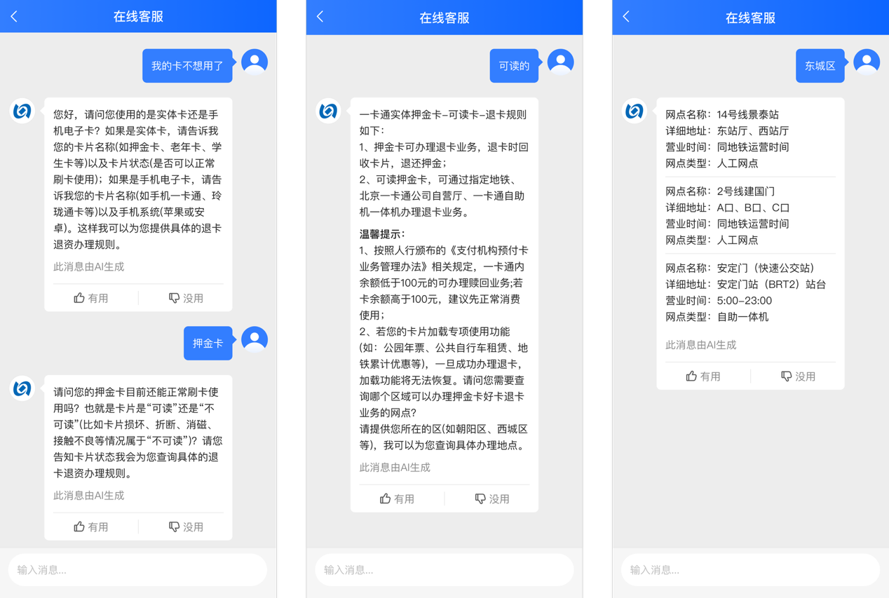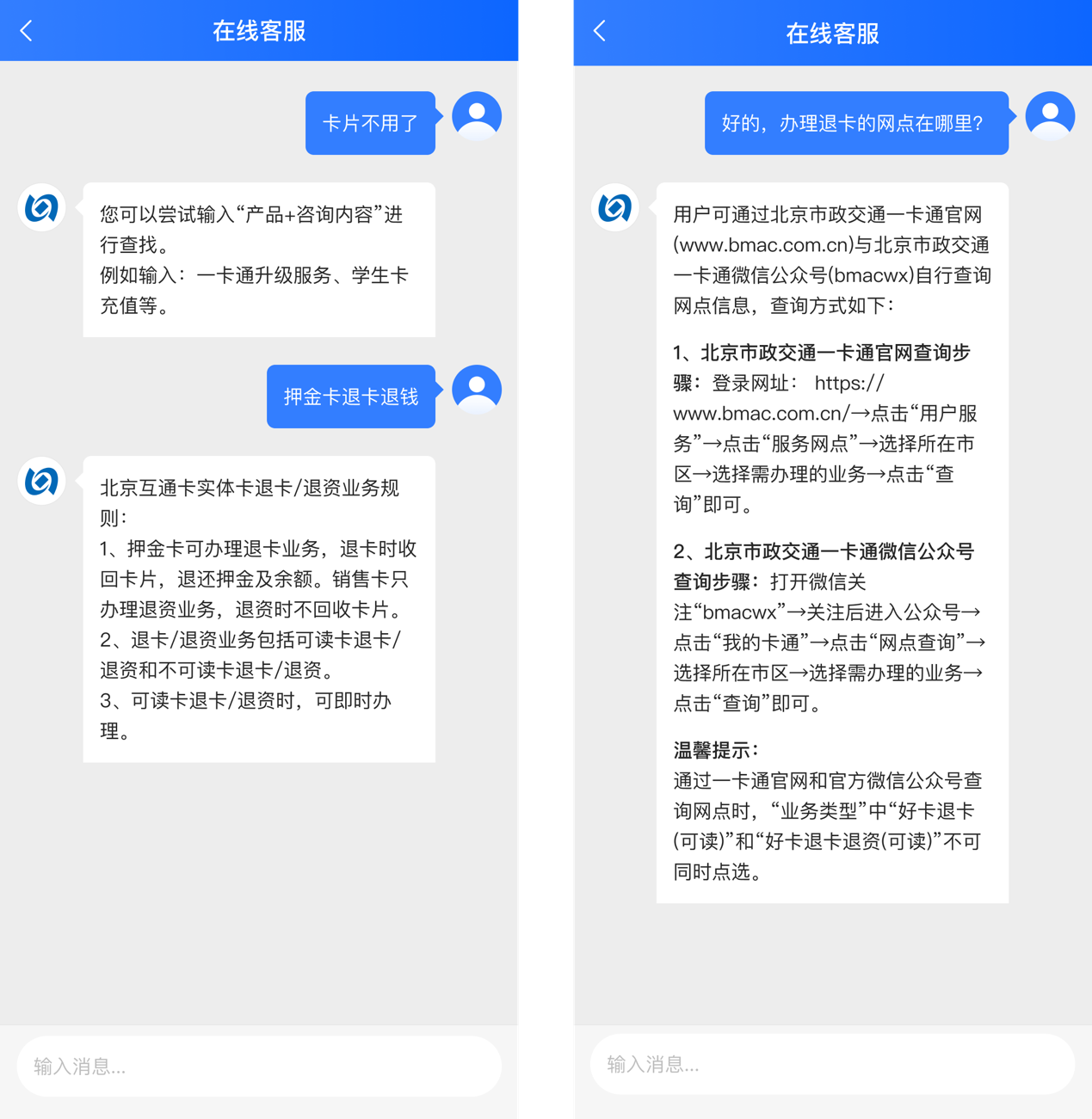 北京一卡通负责交通智能卡的制作、发售、应用和结算业务,已累计服务近2亿用户,旗下有非常多不同类型的卡。因为各种原因,用户会有退卡退钱的咨询需求,从用户意图识别到卡类型、卡状态确认再到办理规则的告知和办理网点的查询,整个过程涉及到多轮沟通。以前通过NLP客服机器人处理,这样的一个咨询,从进线到解决,整个过程最长需要花费30分钟。