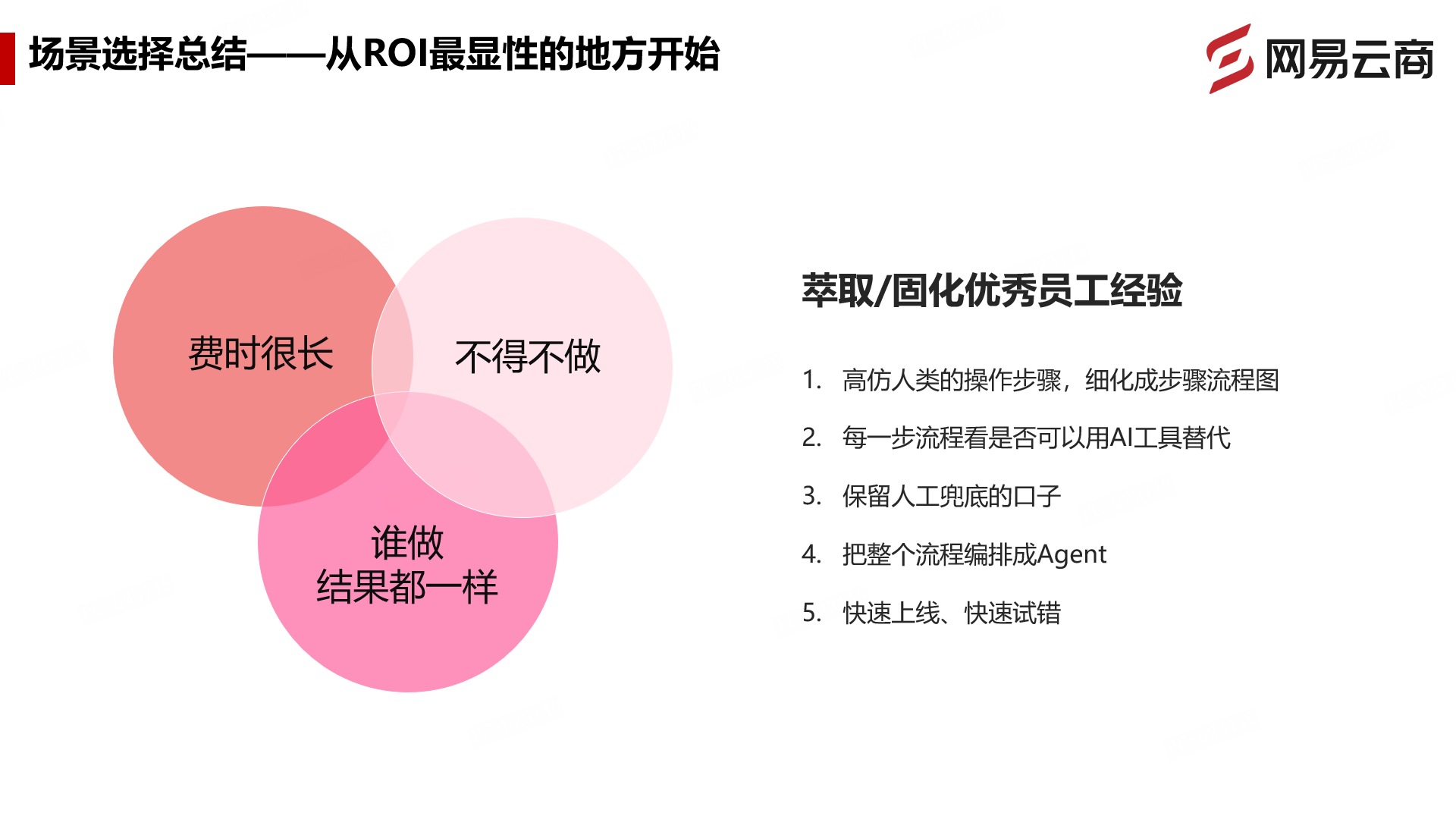 对于如何衡量高ROI场景,肖钰妍给现场的观众提供了“三把尺子”:费时很长、不得不做、谁做结果都一样,并分享了具体的场景案例。